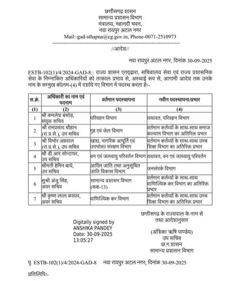 जिला स्तर पर भी बदलाव हुए हैं। कलेक्टर सर्वेश्वर भुरे के केंद्रीय प्रतिनियुक्ति पर जाने की वजह से उनकी जगह आईएएस जितेंद्र यादव (2019 बैच) को कलेक्टर राजनांदगांव बनाया गया है, जबकि पठारे अभिजीत बबन (2022 बैच) को सीईओ जिला पंचायत रायगढ़ पदस्थ किया गया है।