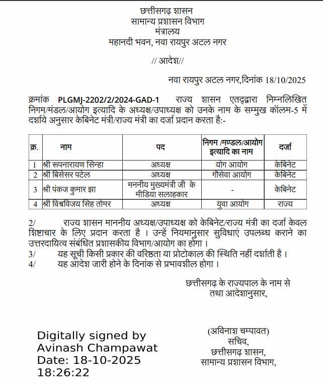 सरकार के इस कदम को संगठन संतुलन और आयोगों की सक्रियता बढ़ाने से जोड़कर देखा जा रहा है। मुख्यमंत्री साय के करीबी माने जाने वाले पंकज झा लंबे समय से मीडिया प्रबंधन और रणनीतिक मामलों में सक्रिय भूमिका निभा रहे हैं। वहीं, विश्वविजय तोमर युवा मोर्चा से लेकर संगठन स्तर पर लगातार सक्रिय रहे हैं।