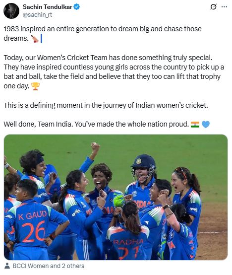 सचिन तेंदुलकर ने एक्स पर लिखा कि 1983 ने एक पूरी पीढ़ी को बड़े सपने देखने और उन सपनों को पूरा करने के लिए प्रेरित किया। आज, हमारी महिला क्रिकेट टीम ने कुछ सचमुच खास किया है। उन्होंने देश भर की अनगिनत युवा लड़कियों को बल्ला और गेंद उठाने, मैदान में उतरने और यह विश्वास करने के लिए प्रेरित किया है कि वे भी एक दिन यह ट्रॉफी उठा सकती हैं। यह भारतीय महिला क्रिकेट की यात्रा में एक निर्णायक क्षण है। शाबाश, टीम इंडिया। आपने पूरे देश को गौरवान्वित किया है।